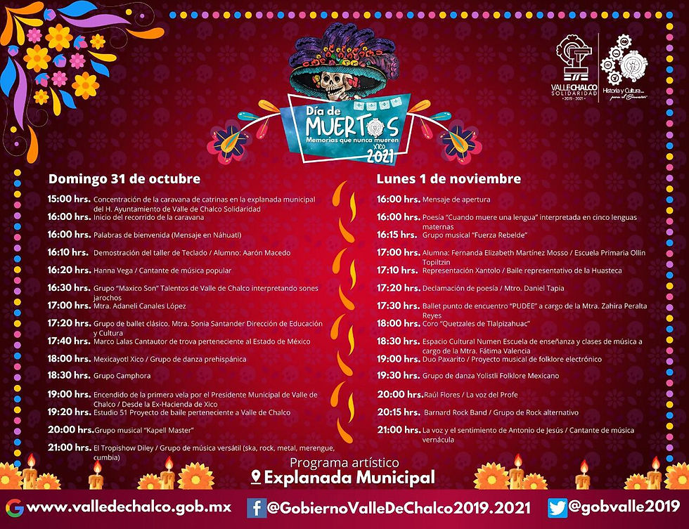 Valle de Chalco, México. Para conservar las costumbres y tradiciones que dan identidad a Valle de Chalco, el gobierno municipal organiza con todas las Direcciones de la administración pública 2019-2021, un amplio programa artístico y cultural con motivo del Día de Muertos.